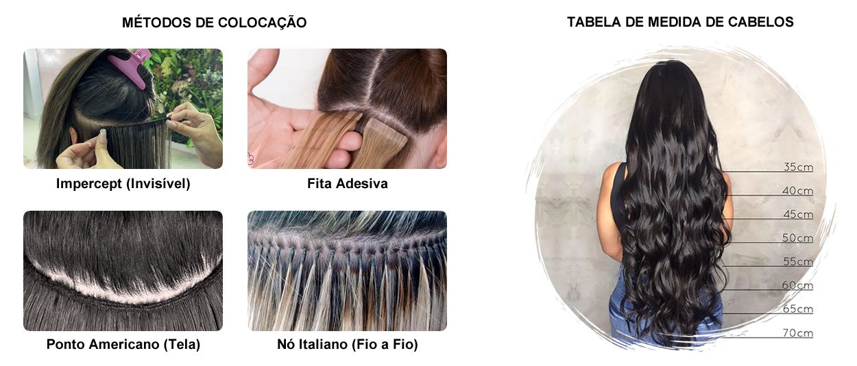 Fita Adesiva: Considerada uma das mais práticas e naturais, as mechas são presas por uma fita adesiva de silicone rente à raiz. Ideal para cabelos finos e leves, com manutenção a cada 6-10 semanas.